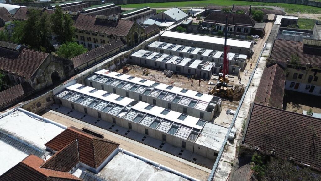 Junto al desarrollo de las tareas de montaje de los paneles, la UTE a cargo de la obra (conformada por las empresas Mundo Construcciones y De Paoli & Trosce) también realiza instalaciones eléctricas y de corrientes débiles, revoque interior en las celdas, colocación de artefactos sanitarios y trabaja en la cubierta liviana de los pabellones.