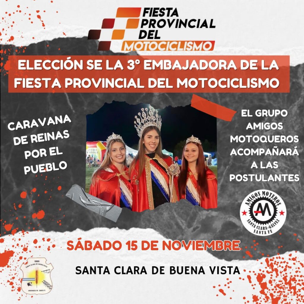 Además, se realizará la elección de la 3° Embajadora de la Fiesta Provincial del Motociclismo, con una colorida caravana de reinas por el pueblo, acompañadas por el grupo Amigos Motoqueros de Santa Clara y Gálvez.