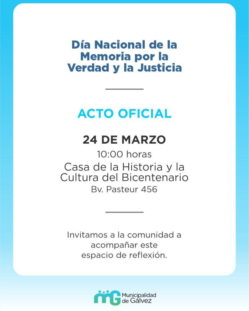Invitamos a la población a participar del Acto Oficial por el Día Nacional de la Memoria, por la Verdad y la Justicia.